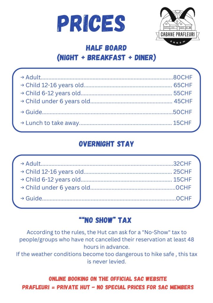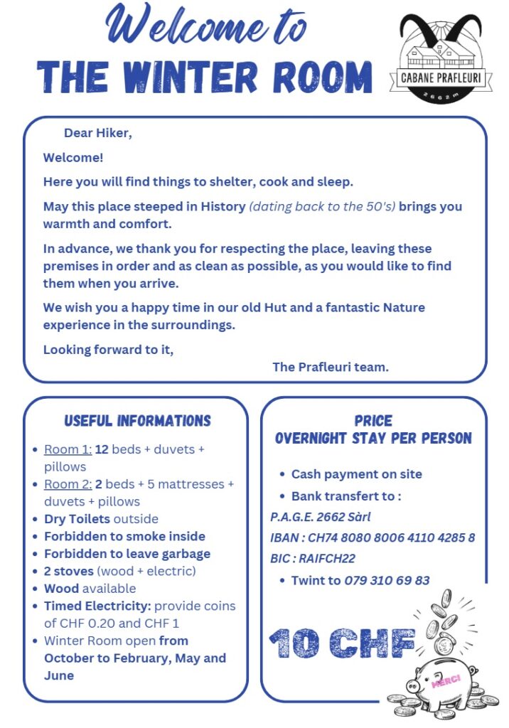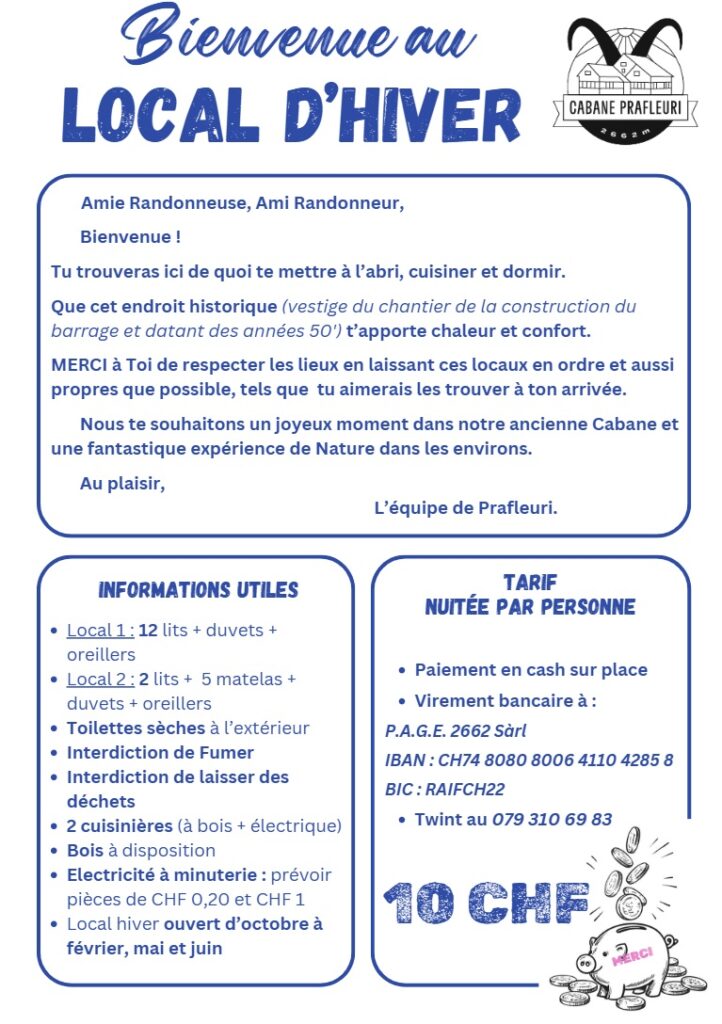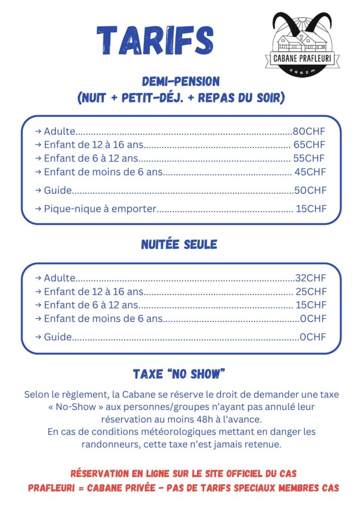 La Nuitée est de 10CHF par personne. PAS DE RÉSERVATION PRÉALABLE.